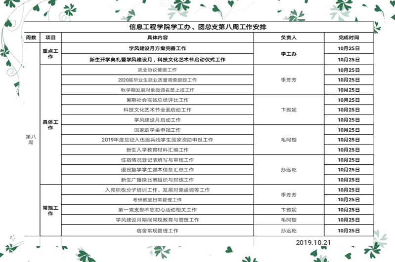 信息工程乐鱼(中国)学工办、团总支第八周工作安排